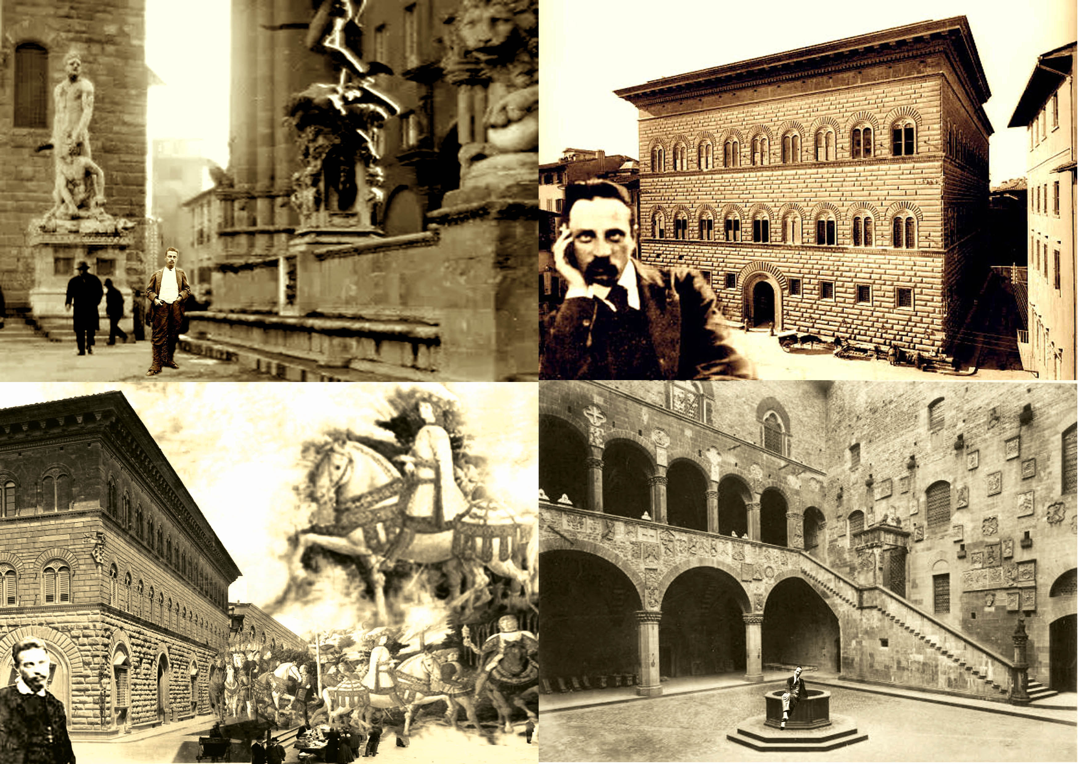 La prima parte del percorso riprende l’incontro del giovane con la città la prima sera dell’arrivo a Firenze (cap. IV L’arrivo a Firenze; Diario pp. 59 e succ.): lungarno Torrigiani, Ponte Vecchio, Piazza della Signoria, Loggia dell’Orcagna, piazzale degli Uffizi e le statue dedicate a personaggi che dettero vita alla stagione del Rinascimento.