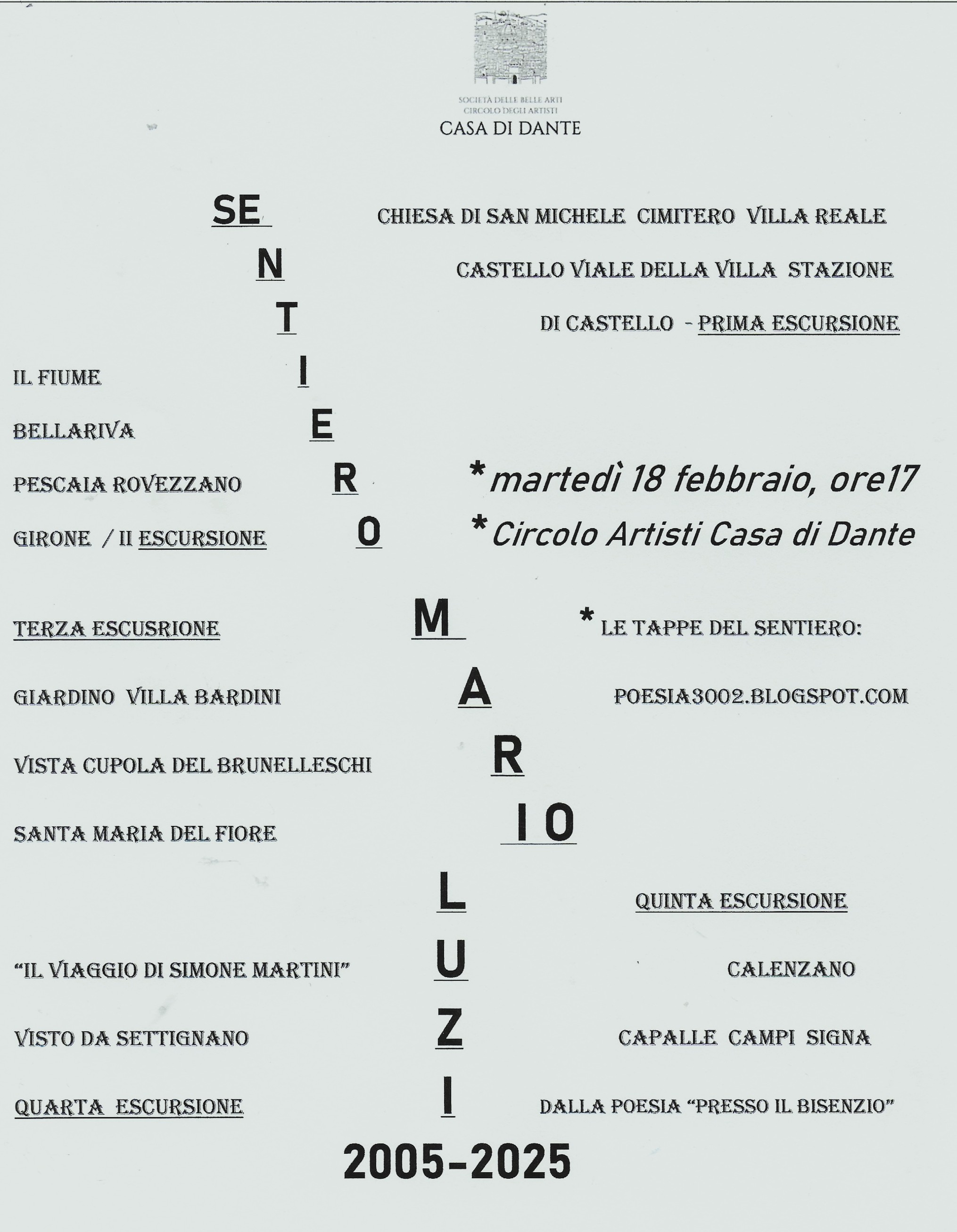 I - L’Anello del Rinascimento: per Monte Senario, di Mario Luzi “Vanno ai monti i monti”; per l’argine del Bisenzio, presso Campi, “Magma” di Mario Luzi; per il bosco di Fonte Santa “Incredibile la morte” dal libro “Orfeo in Fonte Santa dell’autore.